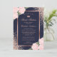 Elegante convite de 16 anos, doce, de ouro azul e rosa, com detalhes da festa, dentro de um quadro de ouro rosa adornado com rosas cor-de-rosa pinceladas e confete.
