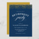 Este convite de festas de aposentadoria oferece um design de na moda acentuado com script elegante e configuração de brilho dourado em um fundo azul marinho.
