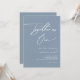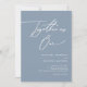 Design apresenta um script relaxado e caprichoso com uma citação "Juntos como um". Um convite de casamento azul.