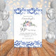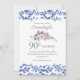 Folha azul e branca, folha floral, sem costura, padrão repetitivo em fundo, uma camada de forma de flor branca e modelos criados para um aniversário especial. Um arranjo floral cor-de-rosa azul e pincelado no centro, "Parabéns", texto curvo acima dele.