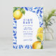 Convide seus convidados para uma celebração encantadora com nosso Convite para Chá de fraldas Azul Amalfi, italiano Lemon. Esse convite capta a essência do atordoante litoral Amalfi com seus vibrantes motivos de limão e intrincados designs azuis, perfeitos para um chá de fraldas fresco e elegante.