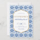 Um convite moderno e elegante para aniversário de 30 anos, com azulejos de cor azul-d-água inspirados nas tradições mediterrânicas e um quadro de ouro sequenciado (são efeitos digitais). Personalize-o com o nome, a data, a hora e todos os detalhes. Caligrafia moderna para o título. Um convite encantador para uma jovem de trinta anos, no seu trigésimo aniversário: filha, namorada, esposa, irmã, etc.