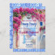 A ilha grega pintada com aquarelas Mamma Mia-tematizada design "encontrou seu mel" com flores cor-de-rosa magenta de bougainvillea e azulejos mediterrânicos azuis.