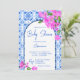 Azulejos Azuis e Bougainvillea elegante Mediterrâneo Grego Santorini Mykonos modelo de convite de chá de bebê para download instantâneo.