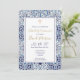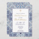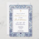 Primeira Comunhão Elegante ou evento religioso com belos azulejos azuis e cruz de ouro. Encontre produtos correspondentes em nosso compro ou entre em contato conosco.