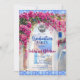 Desenho de festa temática Mamma Mia da ilha grega pintado com aquarela com flores de bougainville magenta rosa e azulejos mediterrâneos azuis.