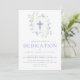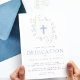 Um convite elegante para o perfeito para a dedicação, batismo ou batismo do seu filho. Este design apresenta uma coroa de aquarela quadrada com flores e folhas azuis-claras, com uma cruz azul no centro. O título do evento está em fonte azul-serif. O reverso apresenta um padrão listrado azul e branco.