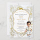 Bebê de terno branco. O fundo do convite é o cetim branco, o filigre dourado, uma moldura dourada e prateada e um embelezamento do arco. A parte de trás é enfeitada com padrão de flores douradas e fita dourada sobre fundo branco de cetim.