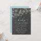 Brrr! Convites chiques para chás de fraldas de inverno cheios de uma borda superior de flocos brancos de neve contra um fundo de quadro de chanfro, com "bebê está frio lá fora" em letras azuis e brancas. Personalize com seus detalhes de chá do bebê embaixo usando os campos de modelo. Cartões à volta do azul de gelo.