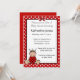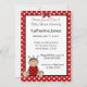 Bebê Ladybug bonito em um fundo vermelho e branco pontilhado. Use nossa modelo fácil para personalizar com as informações de sua parte.