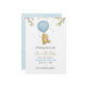 "Baby shower invitation featuring a cute bear holding a blue balloon, surrounded by stars and leaves. Text reads: 'A little hunny is on the way!' and 'Save the Date for the baby shower of Sophia and Richard, Aug 12, 7 PM.'"