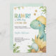 Baby shower invitation featuring a cheerful dinosaur hatching from an egg, surrounded by green leaves. "RAWR! A little boy is hatching soon!" with details below. The background is light with playful, vibrant tones.