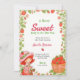 A baby shower invitation with a "Berry Sweet" theme. Features a whimsical illustration of a child in a strawberry-patterned outfit and a basket of strawberries. Text includes event details and RSVP information, bordered by berry vines. The tone is playful and cheerful.