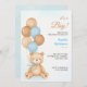 Baby shower invitation with a cute teddy bear holding blue and brown balloons. "It's a Boy!". Light blue and beige tones create a joyful ambiance.