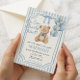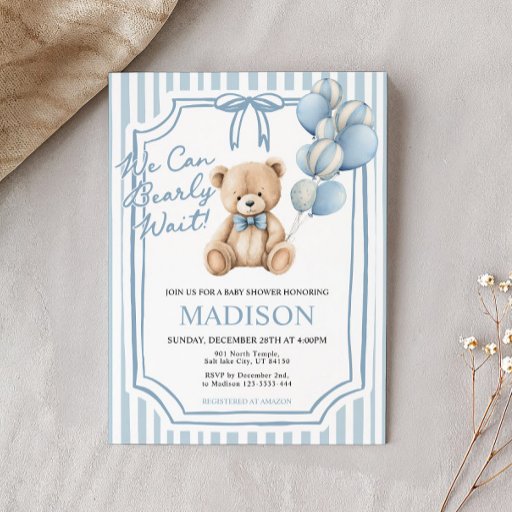 Celebrate your little one on the way with this adorable “We Can Bearly Wait” baby shower invitation featuring a cute watercolor teddy bear with blue balloons. Perfect for a baby boy shower, this sweet and timeless design sets a cozy and loving tone for your special day.