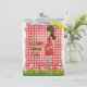 Mãe grávida com guarda-chuva em fundo de gingham vermelho.