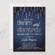 Um convite de festa de solteira moderno, elegante e chic com um tema de denim e diamantes. Apresenta um fundo denim, letras personalizadas para a palavra "denim" e tipografia em branco, assim como gotas elegantes de rotinas (efeito digital) com um tema de trabalho de vara. Um design de "denim e diamantes" chic para uma festa de solteira de classe, brilho, na moda! Uma noite de senhoras com uma vibe de um país que será tão memorável quanto a noiva a ser!