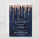 Este convite para festas de solteira de casamento, bonito e feminino, é perfeito para o evento de tendências e na moda. Ele apresenta pingos de brilho rosa dourado cintilantes impressos em falso sobre um fundo azul marinho escuro. É moderno, glamouroso, chique, único e legal; o design perfeito para o seu dia especial. ***NOTA DE DESIGN IMPORTANTE: Para qualquer solicitação de design personalizada, como solicitações de correspondência de produtos, alterações de cor, mudanças de posicionamento ou qualquer outra solicitação de alteração, clique no botão "CONTACT" ou envie um e-mail ao designer diretamente em lafemme.art@gmail.com. Você pode até enviar um e-mail para ela solicitando um design completamente personalizado e novo.