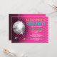 © Socialite Designs Inc. Comemore a festa de solteira da noiva enviando esses convites de festas de bola rosa e prata divertidos. Personalize facilmente o texto do seu evento substituindo o texto do modelo. O design incorpora uma bola prateada, fundo rosa com reflexões e estímulos que podem ser movidos e redimensionados. O texto é feito para se parecer com luzes de néon.