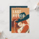 Um último convite elegante de despedida de solteira rodeada com um tema de vintagem retrô, com uma ilustração ao estilo poster de uma bela mulher vestindo um chapéu de cowgirl, em uma pose suja, com um terracota vintage e esquema de cor azul escuro. Um convite de festas divertido de fim de semana da despedida de solteira para uma noiva que adora retrô e vintage, chic country, cowgirl romântica, designs de arte, ilustração. Também perfeito para uma celebração temática do deserto.
