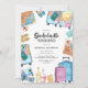 Convites de festa de solteira de férias bonitos com uma seleção de itens de viagem de aquarela incluindo malas, câmera, mapa etc. e um modelo de festa de solteira elegante que é fácil de personalizar.