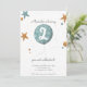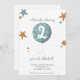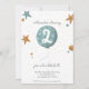 Adorável e simples convite de aniversário de dois anos com uma ilustração divertida de um balão azul e estrelas. Ilustrada e projetada por Patricia Alvarez.
