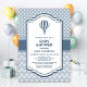 Convide seus amigos e entes queridos com esta cinza e um convite para chá de fraldas de balão de ar quente branco que é decorado com bolinhas e faixas de divisa.