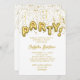 Prepare-se para a festa! O nosso convite de aniversário chic apresenta 'FESTA!' em texto de balão de folha de ouro fresco, rodeado de confete dourado. Os detalhes do seu partido são elegantemente escritos em ouro sobre um fundo branco nítido. A parte de trás do convite é branca e apresenta configuração adicional. Junte-se à comemoração!