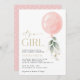 Convide amigos e família de estilo e dê o tom para seu dia especial com este charmoso convite para chás de fraldas. Design apresenta um balão cor-de-rosa com folhas de eucalipto sobre fundo branco.