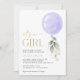 Convide amigos e família de estilo e dê o tom para seu dia especial com este charmoso convite para chás de fraldas. Design apresenta um balão roxo com folhas de eucalipto sobre fundo branco.