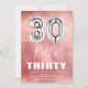 Convite de aniversário moderno 30º projetado com fundo rosa-d-água ombre, confete de bolha transparente e um grande balão de hélio número 30. O nome é escrito em texto branco em grande caligrafia com um simples modelo de aniversário por baixo que é fácil de personalizar.