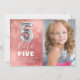 Quinto convite de aniversário moderno para a criança, desenhado com uma foto do aniversariante/menina, um fundo cor-de-água cor rosa, confete de bolha transparente e um balão grande de hélio número cinco. O nome da criança está escrito em texto branco em grande caligrafia com um simples modelo de aniversário por baixo que é fácil de personalizar.