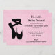 Um convite para o recital de dança de balé. Uma ilustração da silhueta de um par de calçados/chinelos balés pretos que se posam nas pontas dos dedos, conhecidos como pontas de ponta, nos dançarinos de balés clássicos e contemporâneos. O fundo é rosa com pequenas bolinhas brancas. Personalize com os detalhes do evento.