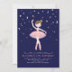 Dança de bailarina personalizada no convite de aniversário de estrelas. Apresentando bailarina em bonito tutu cor-de-rosa com luas, estrelas, brilhos e fundo azul marinho escuro. Chic, elegante e elegante. Vem com design frontal e traseira. Personalizar com o nome, a idade e os detalhes da parte. Opções de imagem da Ballerina disponíveis. Perfeito para bailarinas, balés ou dança sob o tema da estrela.