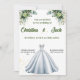 Crie um momento mágico com este convite de casamento etéreo com uma ilustração de vestido de escada de cinza prateada mesmerante. A design apresenta um belo vestido sem fios com um colar amoroso, belamente emparelhado de sabores verdes e botânicos brancos suaves nos cantos. A elegante combinação de tons de vestido de prata e elementos botânicos verdes gentis cria uma estética sofisticada e moderna. Dificuldades em douradas acrescentam um toque de cinza e brilho por todo o design. O fundo branco puro melhora o sentimento fresco e contemporâneo do convite, perfeito para casais que buscam uma mistura de elegância moderna e beleza natural.