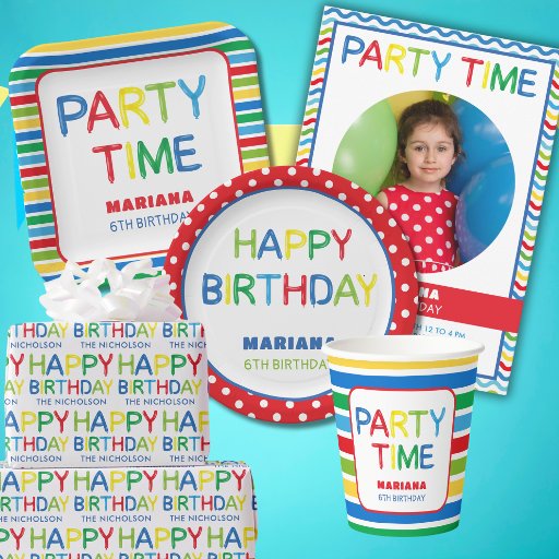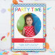 Convite divertido e colorido, com uma frase do tempo da festa de cartas de balão, sua foto favorita e um fundo colorido é a combinação perfeita para uma festa infantil