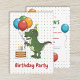 A ilustração original do desenho de Destei de um dinossauro verde T-rex / Tyrannosaurus Rex. O dinossauro está segurando balões de aniversário coloridos e ele está vestindo um chapéu de aniversário colorido. Há também um bolo marrom de aniversário com quatro velas colocadas ao lado do dinossauro. O fundo tem um padrão lúdico de bolinhas coloridas que combinam com as cores dos balões. Na frente, há uma área de texto personalizável que agora diz: "Festa de aniversário" na fonte vermelha. Do outro lado, há mais campos de texto perfeitos para informações personalizadas sobre eventos. O design do outro lado apresenta o chefe do T-rex e alguns balões de aniversário flutuantes. Este design é excelente para a festa de aniversário temática de dinossauros de uma criança, por exemplo.