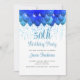 Balões azuis e lacrimejantes e confetti 50º convite de aniversário, 50 com finesse. Matizes azuis ricos em branco. Personalize o seu partido.