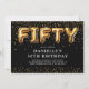 Um convite de 50 anos moderno, com fundo preto na moda, uma dispersão de confete de ouro, balões de ouro hellium que soletram "50", e um modelo de texto de partido elegante, que é fácil de personalizar.