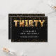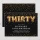 Convite de aniversário de 30 anos moderno com um fundo preto elegante, uma chuva de confetes dourados, balões de hélio dourados que formam a palavra "trinta", e um modelo de texto de festa sofisticado e fácil de personalizar.