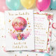 Convites de aniversário cor-de-rosa e dourados para uma garotinha com balão de ar quente bonito e cheio de presentes.