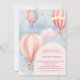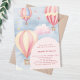 Chá de fraldas de convite para comemorar uma menina. Padrão de balão de ar quente em azul, rosa e amarelo. Personalize e adicione um nome e detalhes da parte. Texto rosa.