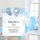 Para um chá de fraldas, comemorando um menino. Um fundo branco chic. Decorados com gotas de brilho azul, aspecto de pingar tinta e balões azuis e prateados. Personalize e adicione o nome da futura mãe e os detalhes da festa. O nome e o texto: Chá de fraldas são escritos com um script de estilo manuscrito
