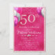 Este convite de festas personalizado apresenta um tema fabuloso de 50 anos em um fundo de design rosa-quente. Os balões de prata e de brilho rosa são colocados em qualquer dos lados do quinquagésimo ano, que é impresso em um padrão de brilho de rosa claro, seguido das informações do evento e da localização. Uma banda glamourosa de diamantes é impressa abaixo do nome de convidado de honra. Confetti acentua as porções superior e inferior. É perfeito para um aniversário, aniversário ou outra ocasião especial.