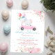 Convite exclusivo de chá de fraldas moço-a-moça com carro vintage cor-de-água rosa com balões e flores.