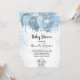 Para um chá de fraldas, comemorando um menino. Um fundo branco chic. Decorado com pingos de brilho azul, pintura pingando, balões e um bebê elefante giro. Personalize e adicione o nome da futura mãe e os detalhes da festa. O nome e o texto: Chá de fraldas são escritos com um script de estilo manuscrito