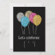 Convide seus amigos com este convite de aniversário bonito, elegante e colorido de balões brilhantes. O design apresenta balões de efeito luminoso prateado, dourado, rosa e azul sobre fundo preto. Simples de personalizar o nome e as informações da parte de trás.