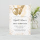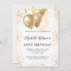 Para uma elegante festa de aniversário 18 (ou qualquer idade). Um fundo branco chic. Decorado com brilho sujo de ouro, faíscas e balões. Personalize e adicione um nome, idade e detalhes da festa. O nome é escrito com um script de estilo manuscrito