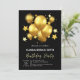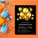 Convite de aniversário elegante com balões de ouro e estrelas cintilantes em uma gota negra. Qualquer convite de aniversário.