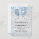 Para um elegante aniversário de 18 anos (ou qualquer idade). Um fundo metálico falso prateado. Decorado com poeira azul esfolada e balões. Personalize e adicione um nome, idade e detalhes da festa. O nome é escrito com um script de estilo manuscrito.